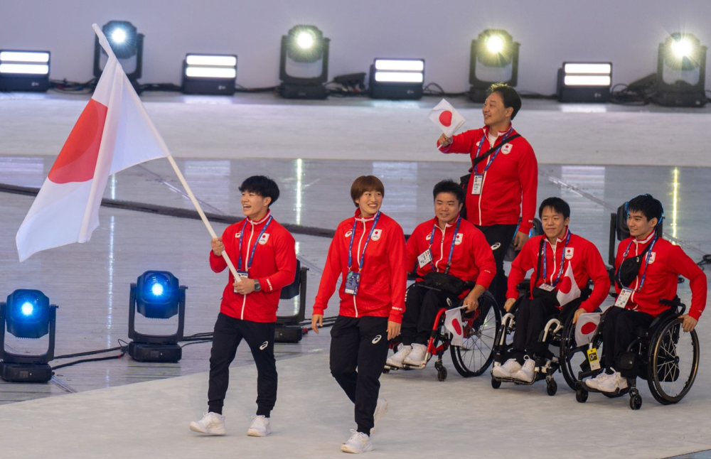 7月16日,日本代表团在2025年莱茵-鲁尔世界大学生夏季运动会开幕式上入场,冈慎之助(左一)担任旗手。