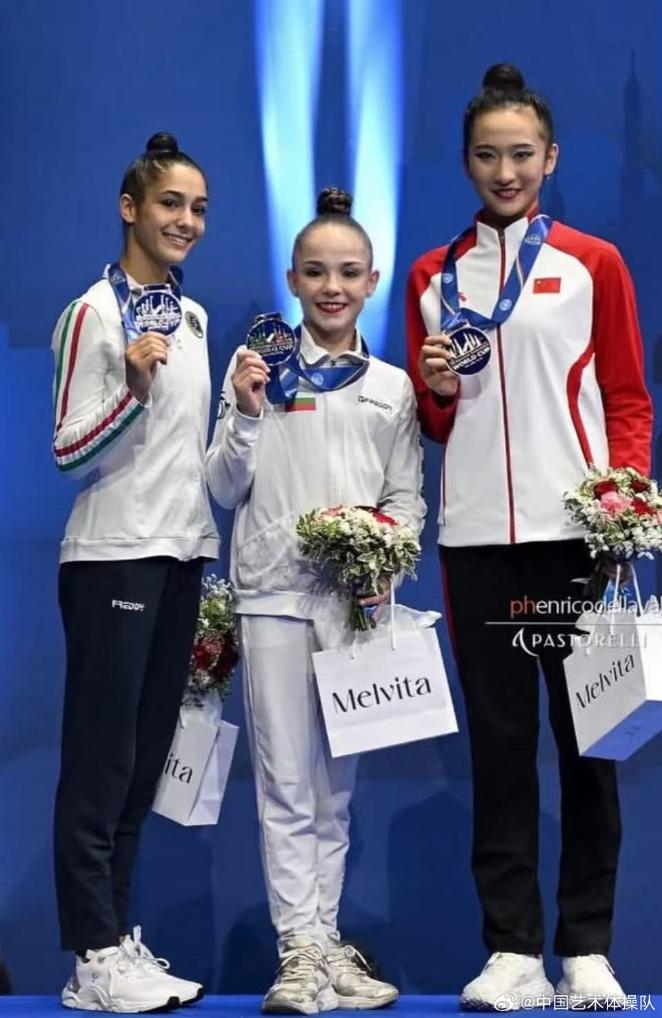 王子露(右)获得国际体联艺术体操世界杯米兰站棒操铜牌。图源中国艺术体操队