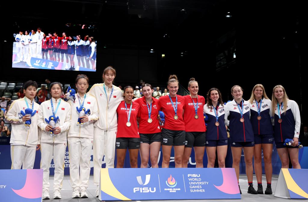 新华社德国波鸿7月20日电(记者韦骅、张荣锋)在20日进行的莱茵-鲁尔大运会女子三人篮球项目中摘得银牌后,中国队并没有展现出沮丧的情绪,球队主教练、清华大学老师杨半伴积极地安排队员们合影留念。队伍在组建时间不长的情况下,取得佳绩,杨半伴为她的球员们感到欣慰。