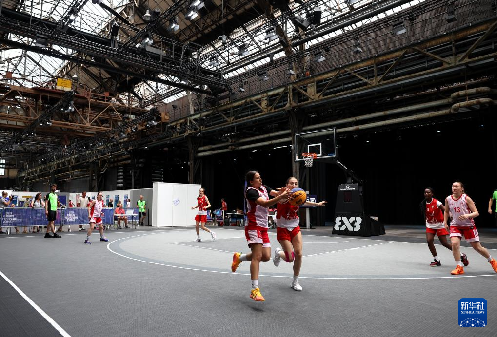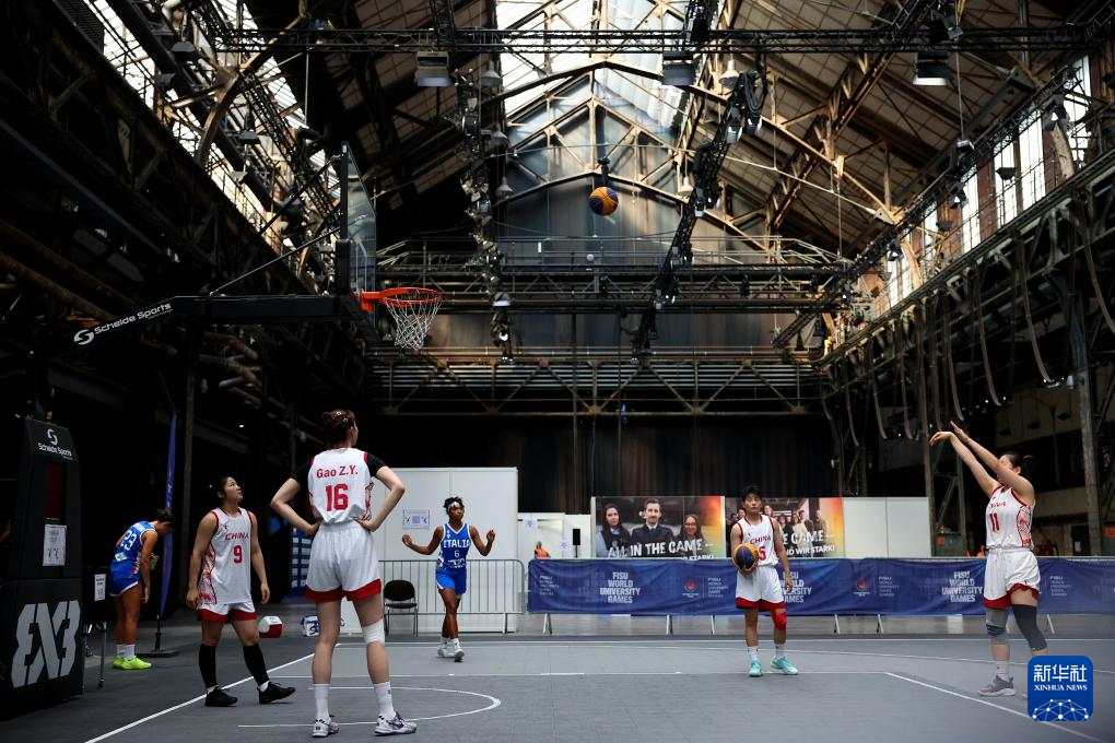 7月19日,在“波鸿世纪厅”内的热身场地,中国队和意大利队的三人篮球运动员进行赛前热身。新华社记者 张晨 摄