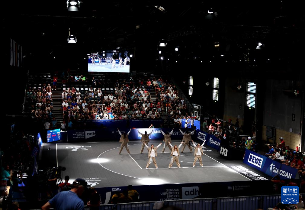 7月19日,在“波鸿世纪厅”内举行的大运会三人篮球比赛间隙,演员在球场内表演。新华社记者 张晨 摄