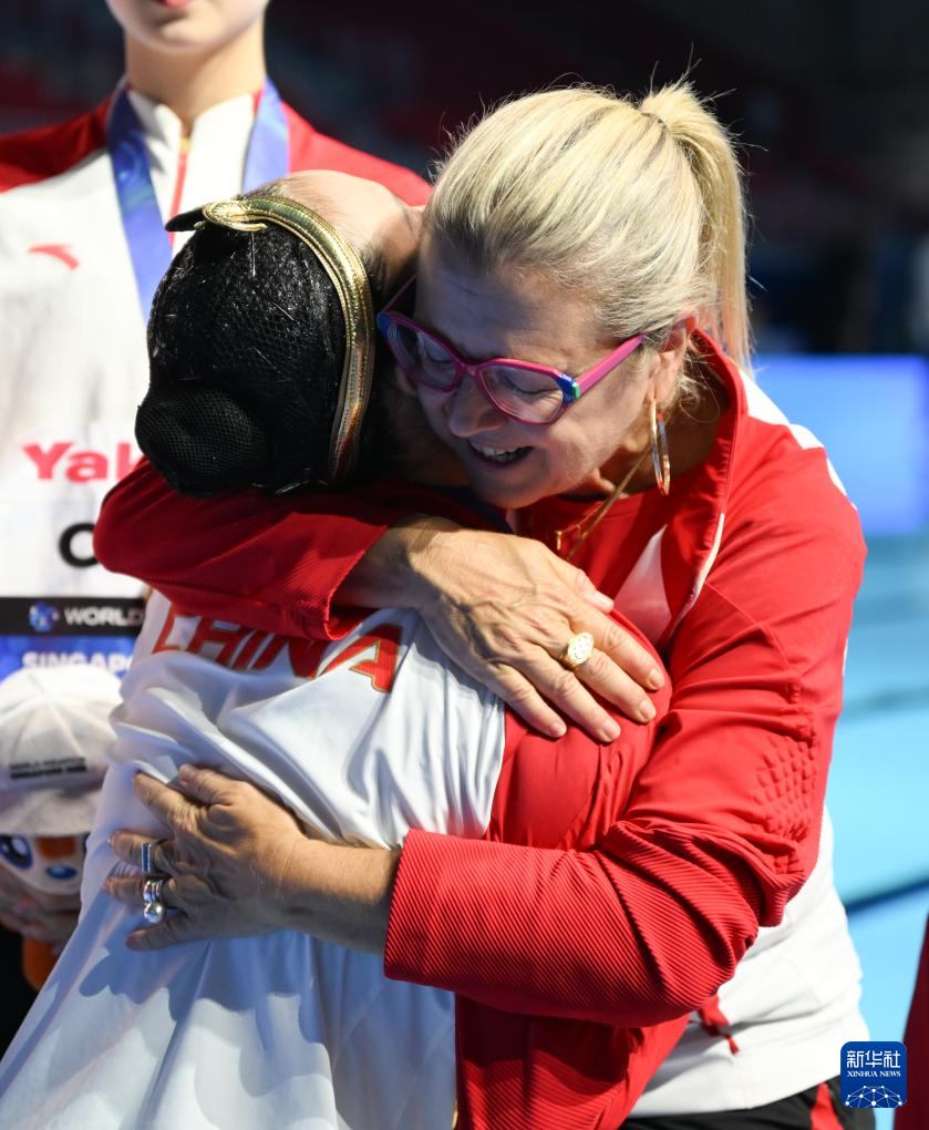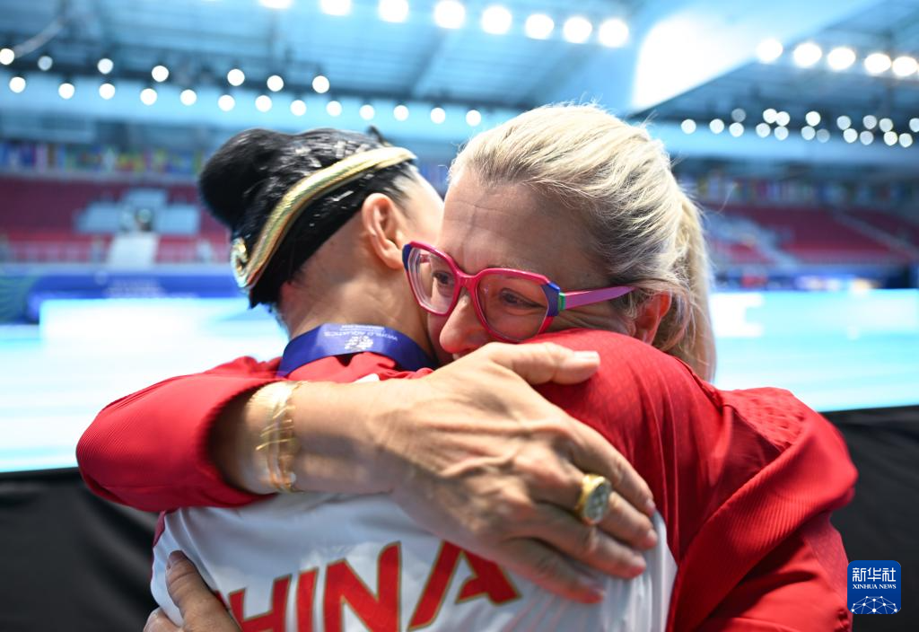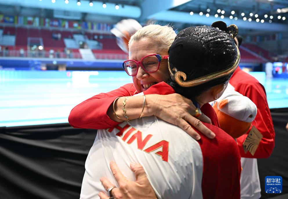 7月22日,中国队教练安娜(右)在颁奖仪式后拥抱队员。新华社记者 夏一方 摄