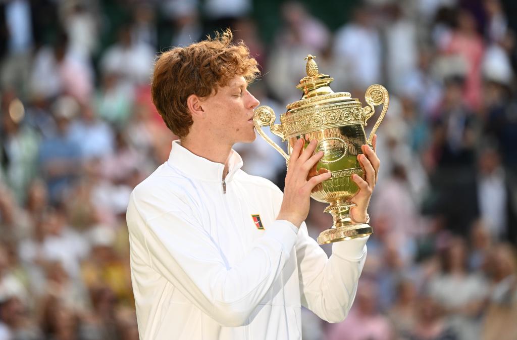 7月13日,辛纳在颁奖仪式上亲吻奖杯。当日,在英国伦敦举行的2025年温网男子单打决赛中,意大利选手辛纳职业生涯首次捧起男单冠军奖杯。新华社记者 李颖 摄