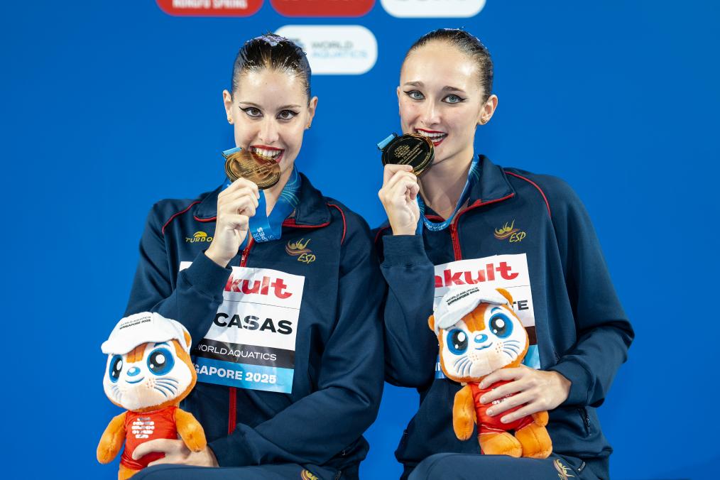 新华社新加坡7月24日电(记者岳晨星、王子江)在24日进行的新加坡游泳世锦赛花样游泳女子双人自由自选比赛中,西班牙组合瓦莱特/卡萨斯夺得金牌,意大利选手皮科利/鲁杰罗、来自俄罗斯的中立运动员组合多罗什科/盖达伊分获第二、三名。中国队选手林彦含/林彦君排名第四。