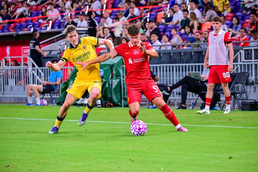 7月26日,AC米兰队球员萨勒马科尔斯(左)在比赛中与利物浦队球员科尔克兹拼抢。