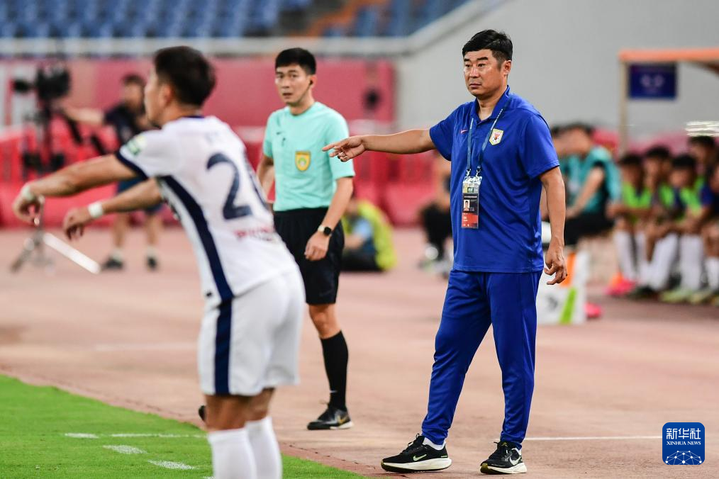 7月27日,山东泰山队代理主教练韩鹏(右)在场边指挥。新华社记者 朱峥 摄