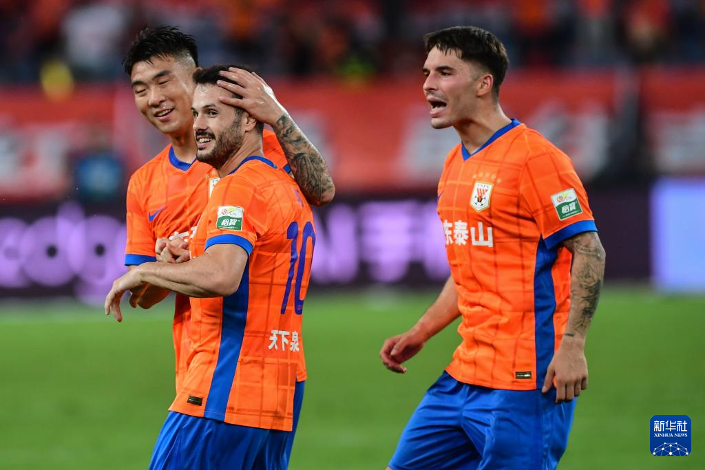 7月27日,山东泰山队球员卡扎伊什维利(左)庆祝进球。新华社记者 朱峥 摄