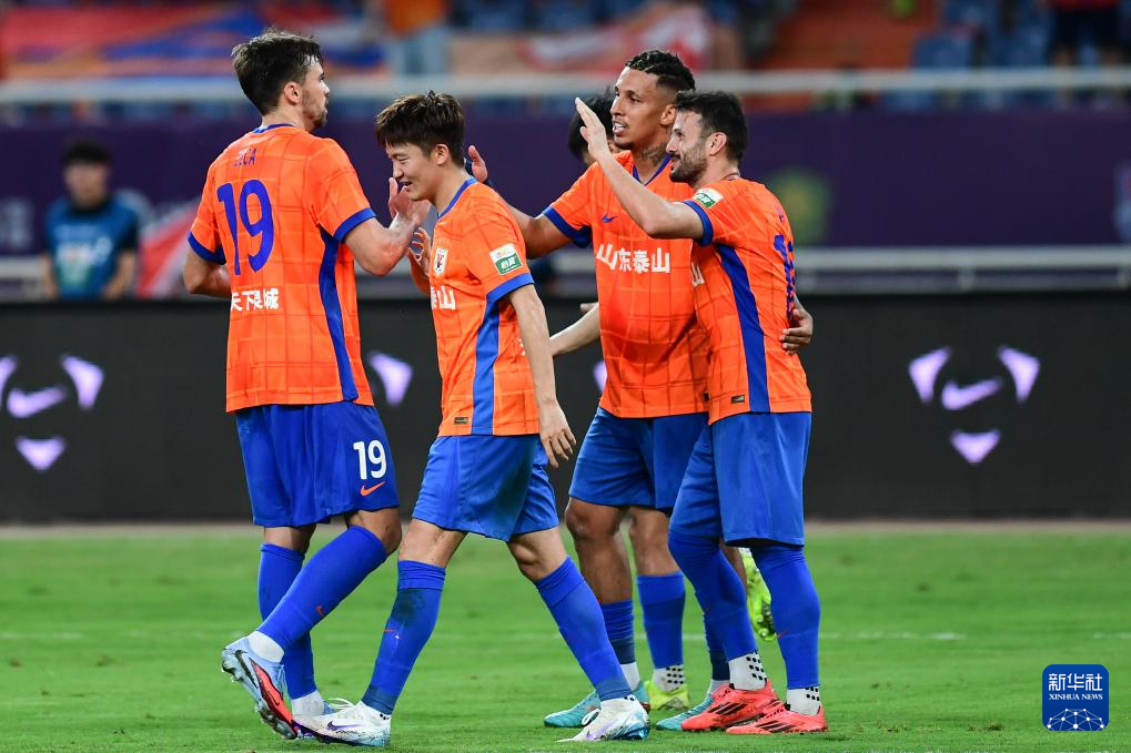 7月27日,山东泰山队球员庆祝胜利。新华社记者 李紫恒 摄