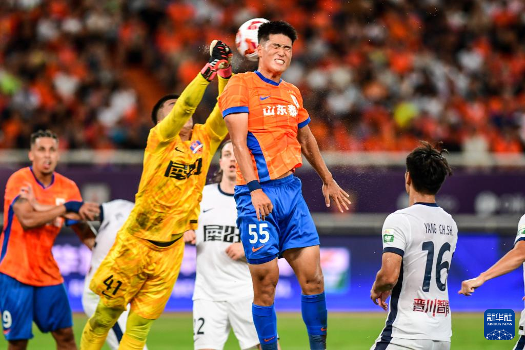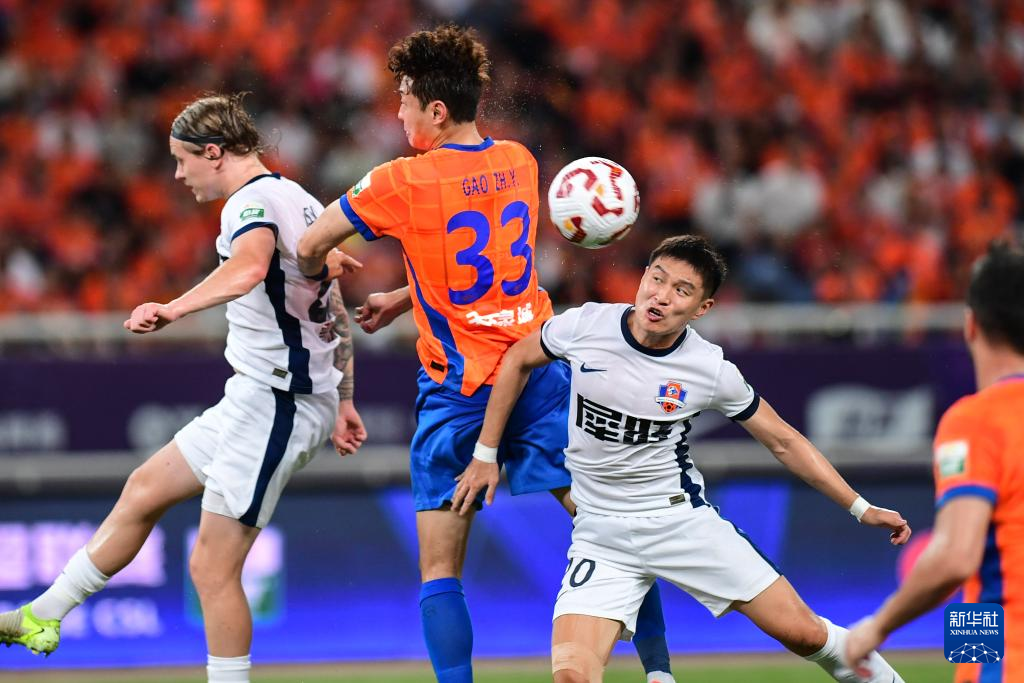 7月27日,山东泰山队球员高准翼(中)在比赛中争顶。新华社记者 朱峥 摄