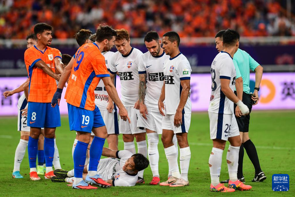 7月27日,山东泰山队球员泽卡(左二)在比赛中确认任意球位置。新华社记者 朱峥 摄