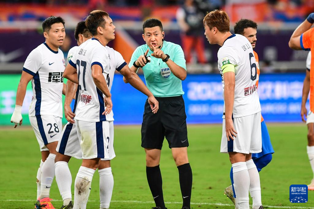 7月27日,主裁判张雷(中)在比赛中判罚。新华社记者 朱峥 摄