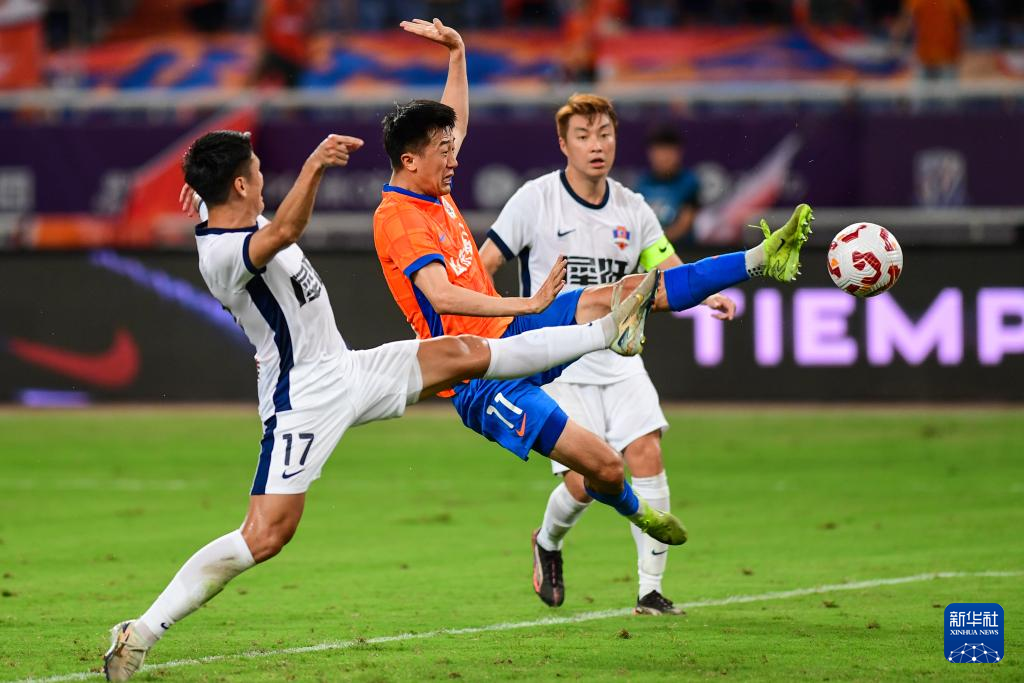7月27日,山东泰山队球员刘洋(中)与梅州客家队球员杨一虎(左)在比赛中拼抢。新华社记者 朱峥 摄