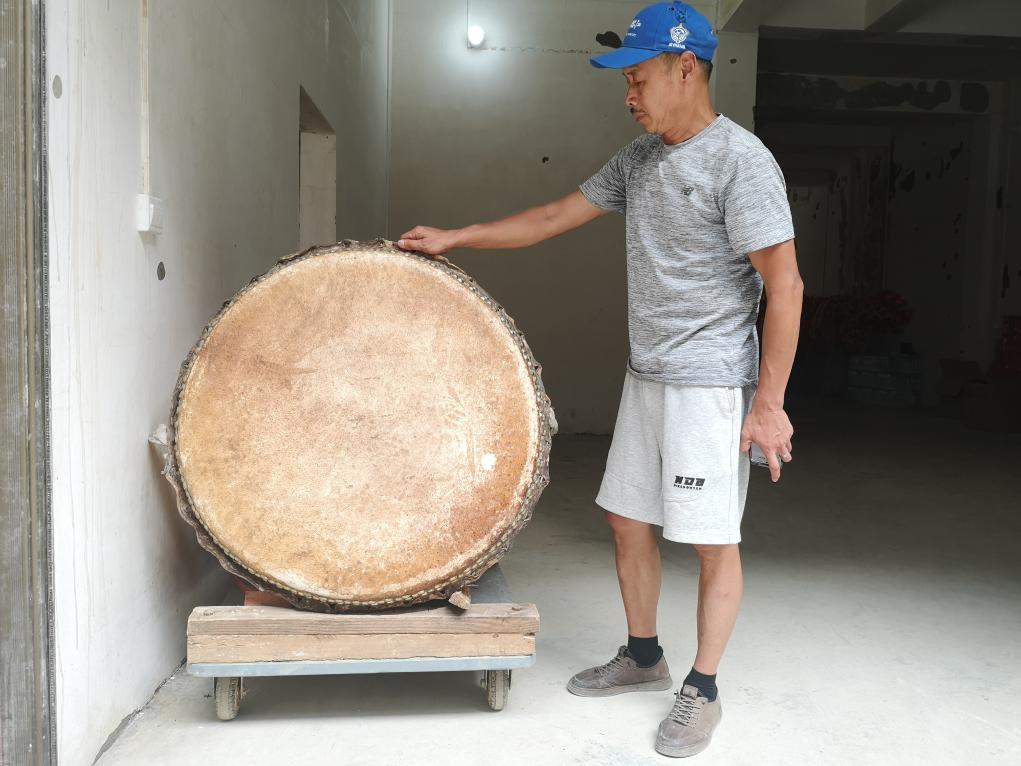 图为7月24日杨明刚查看被洪水泡过的大鼓。新华社记者罗羽摄