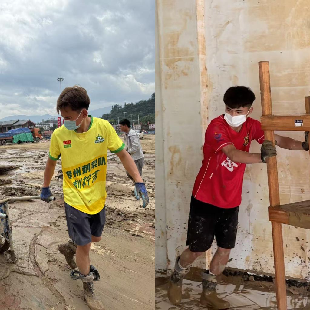 图为“村超”球星李发雄(左)和王香兵(右)在“村超”球场救灾