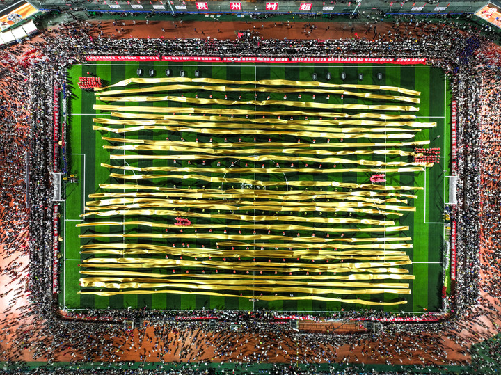 7月26日,人们在贵州“村超”球场表演节目(无人机照片)。新华社记者杨文斌摄