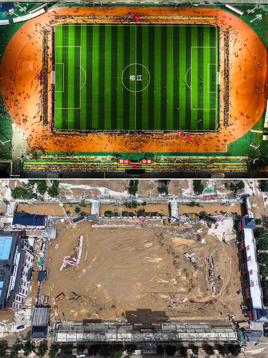 拼版照片:上图为7月25日在贵州榕江拍摄的灾后重建后的“村超”球场(无人机照片);下图为6月25日在贵州榕江拍摄的遭受洪水袭击的“村超”球场(无人机照片)。新华社记者杨文斌摄