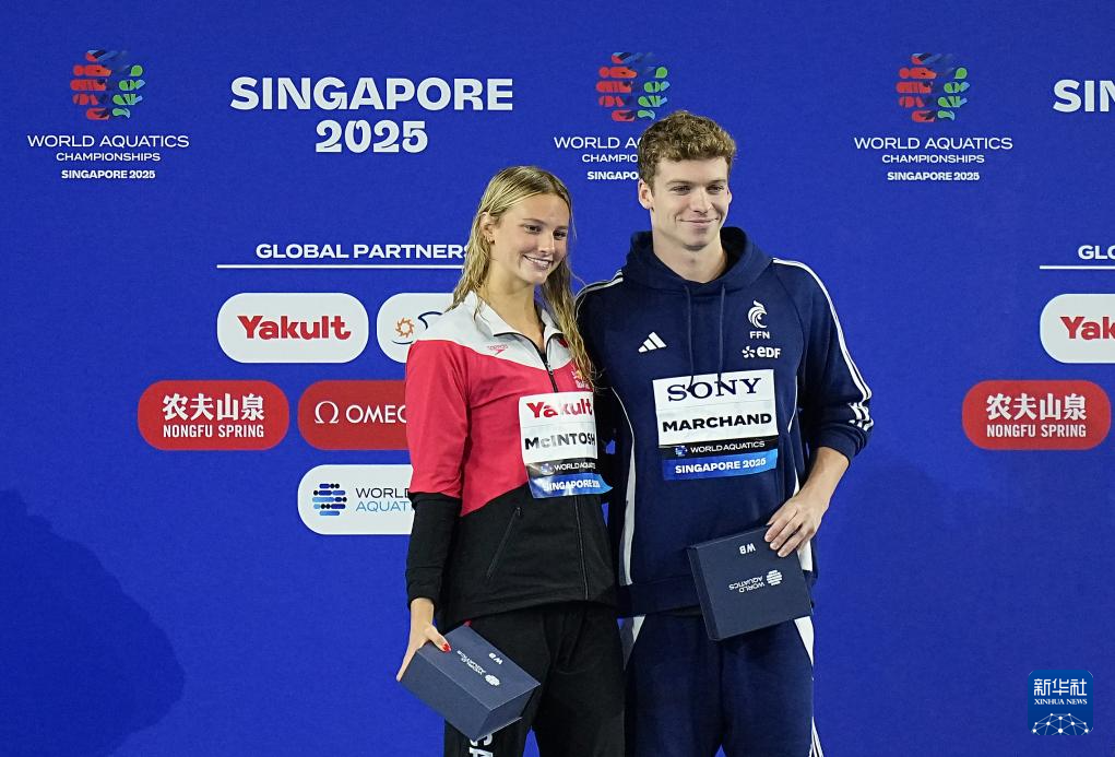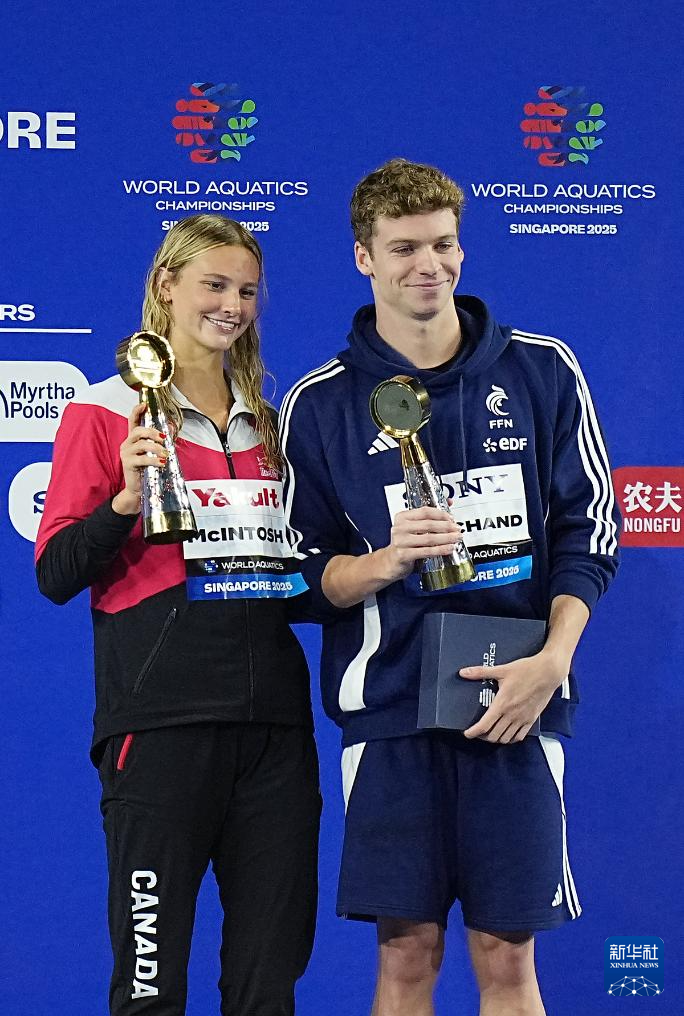 8月3日,获得本届游泳世锦赛游泳项目最佳男运动员的法国选手马尔尚(右)和最佳女运动员加拿大选手麦金托什在颁奖仪式上。
