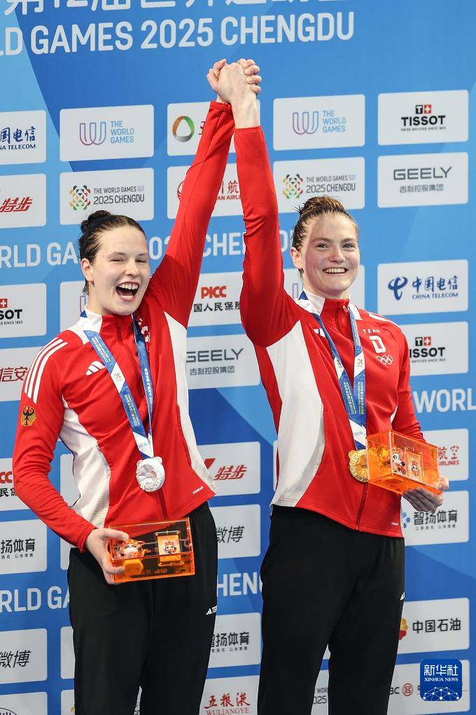 8月8日,冠军德国选手霍尔特(右)与亚军德国选手奥珀曼在颁奖仪式上庆祝。