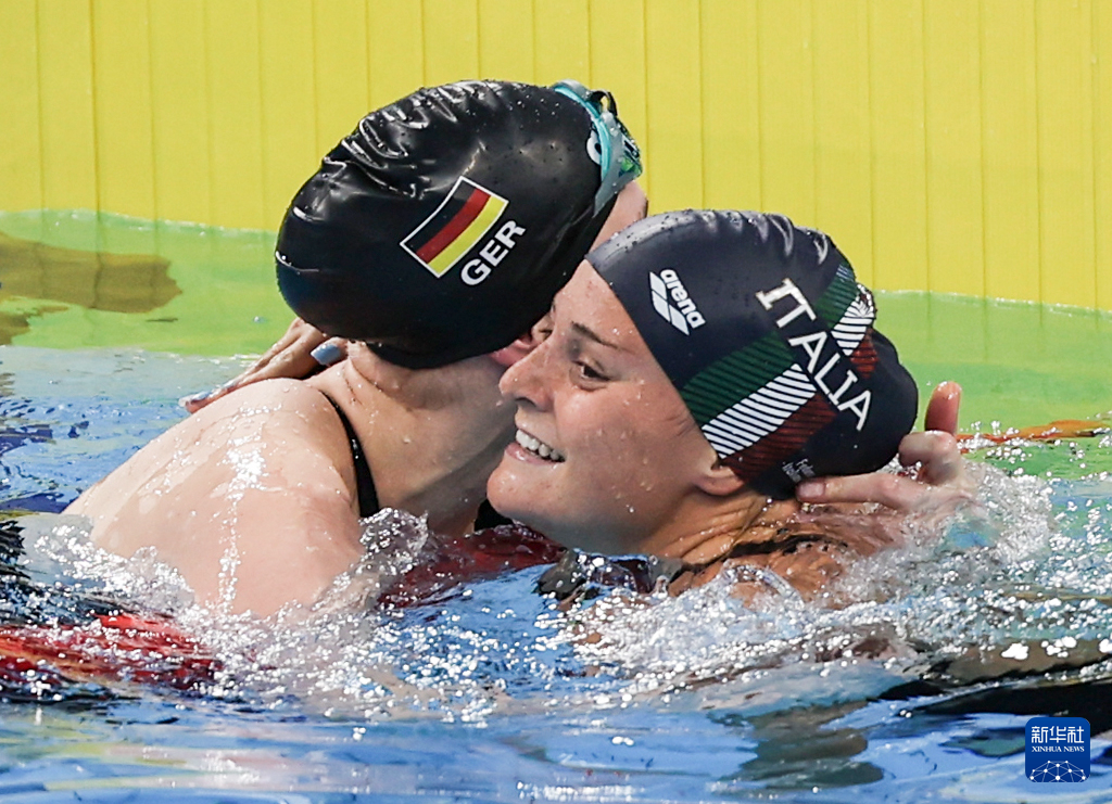 8月8日,德国选手霍尔特(左)和意大利选手皮罗瓦诺在比赛后拥抱。最终,霍尔特以1分03秒69的成绩获得冠军并创造了该项目新的世界纪录,皮罗瓦诺获得第七名。