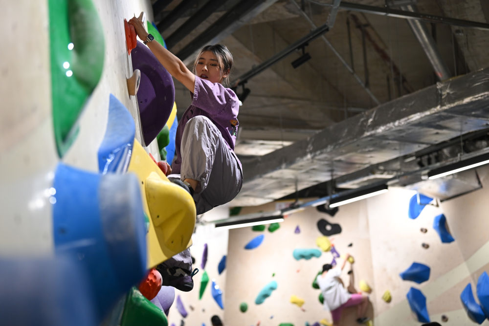 ↑在成都一家攀岩馆内,教练在指导孩子们攀岩技巧(2024年7月15日摄)。