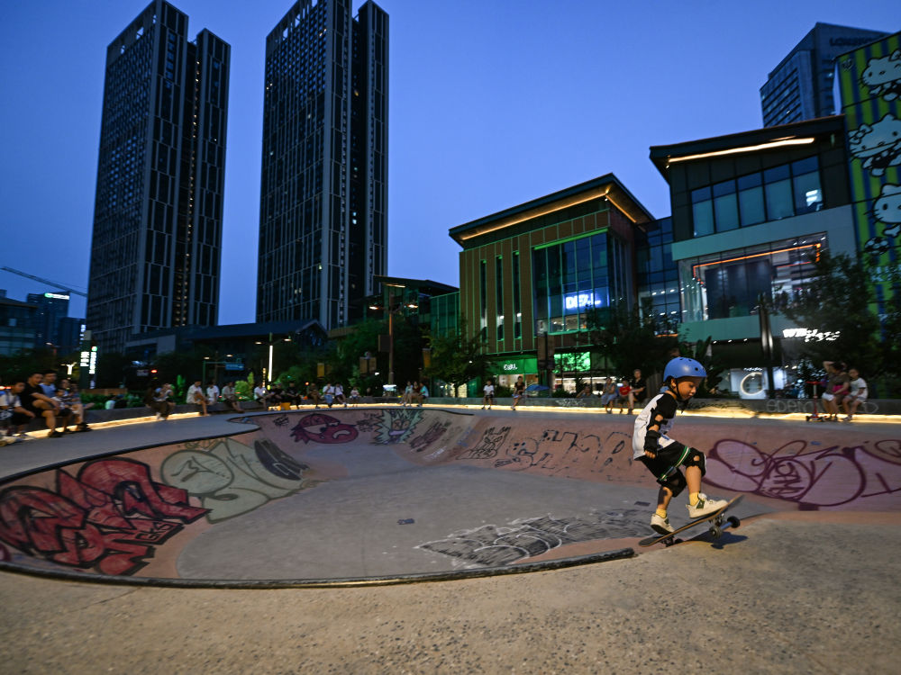 ↑在成都铁像寺水街,一位母亲带着儿子在玩滑板(2023年7月14日摄)。