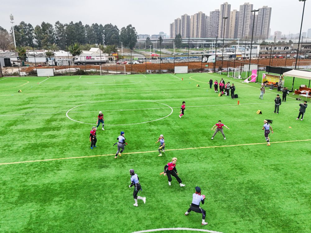 ↑在成都一处运动场,腰旗橄榄球爱好者在进行比赛(2025年3月8日摄,无人机照片)。