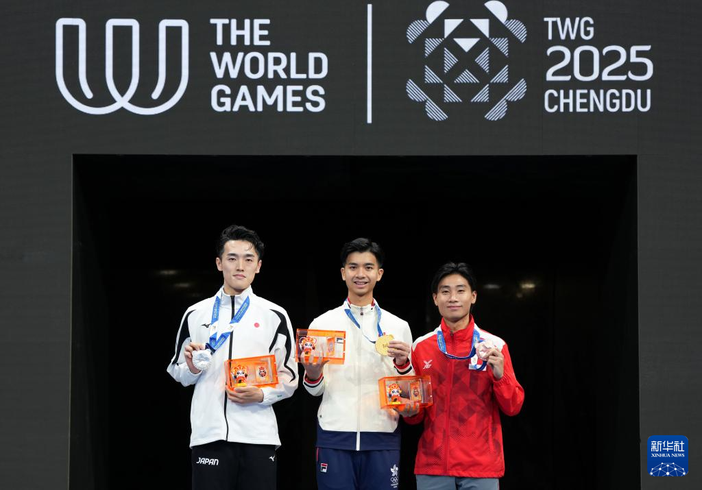 8月9日,亚军日本选手荒谷友硕、冠军中国香港选手杨颂熹、季军新加坡选手郑宇轩(从左至右)在颁奖仪式上。