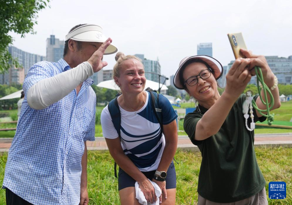 8月8日,爱沙尼亚选手克丽斯廷·拉特(中)在赛后与观众合影。