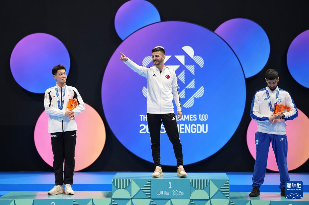 8月8日,冠军土耳其选手桑丹(中)、亚军日本选手桥本大梦(左)与季军希腊选手克塞诺斯在领奖台上。