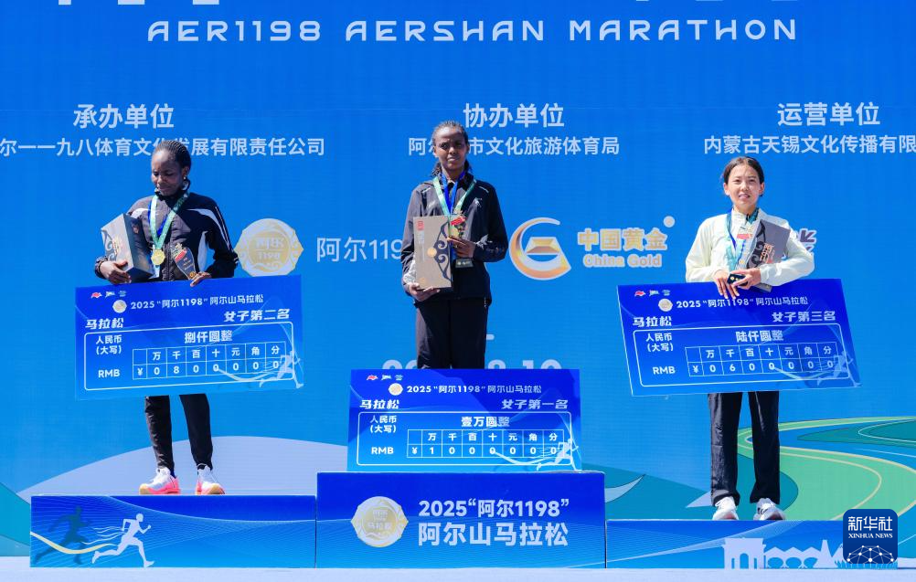 8月10日,亚军肯尼亚选手基普罗蒂奇、冠军埃塞俄比亚选手古塔、季军中国选手通拉嘎(从左至右)在女子全程马拉松颁奖仪式上。