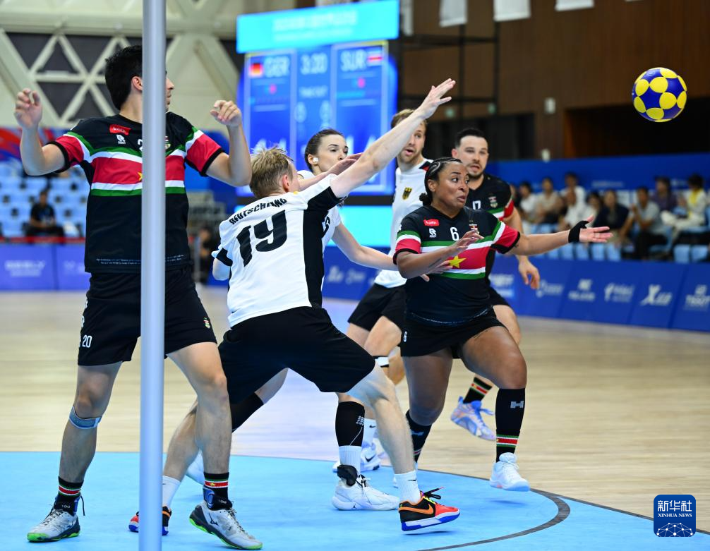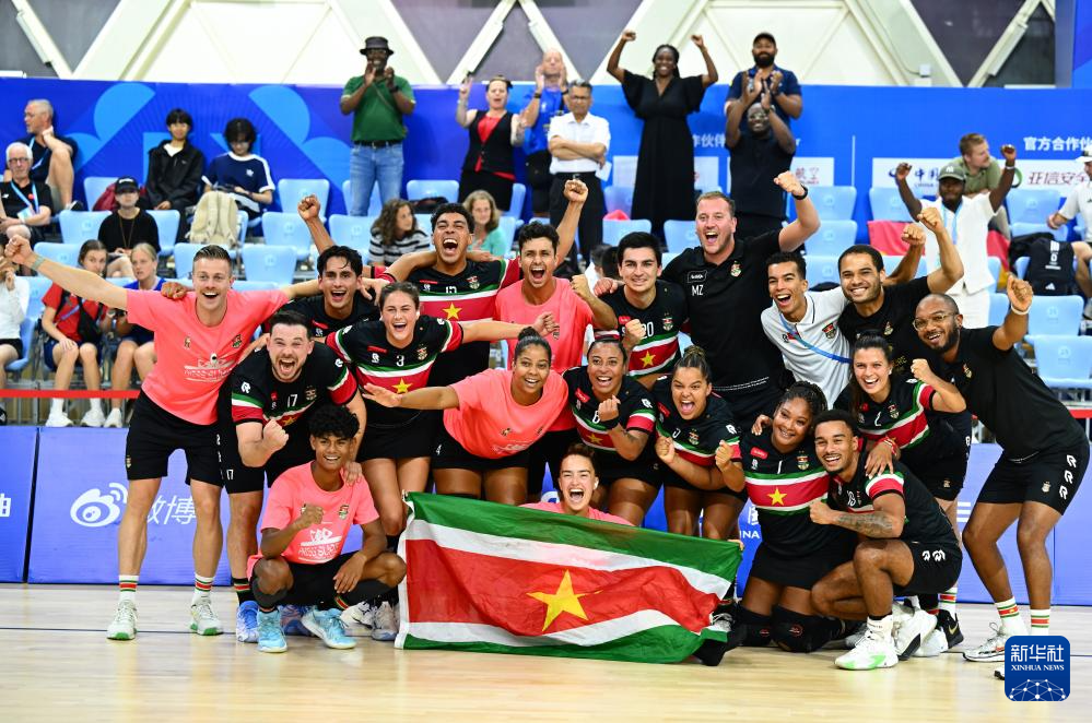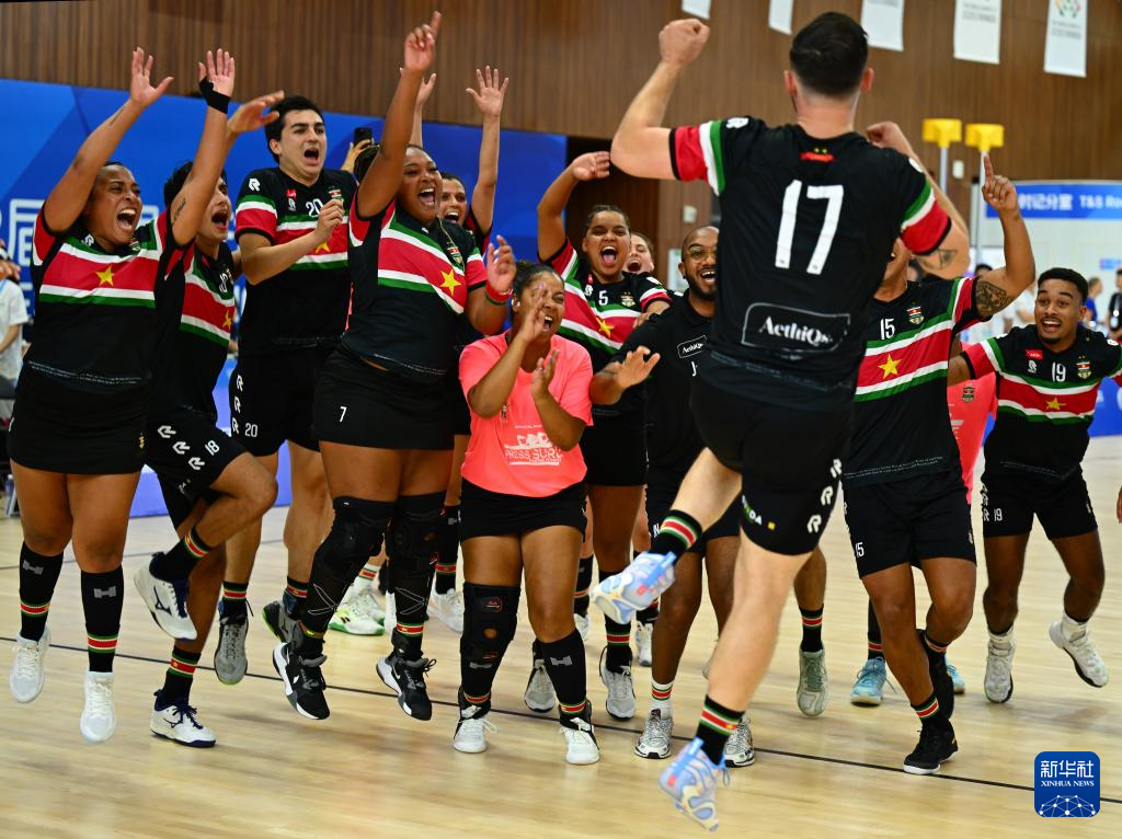 当日,在2025年成都世运会荷球混合团体赛第五名争夺赛中,苏里南队战胜德国队。