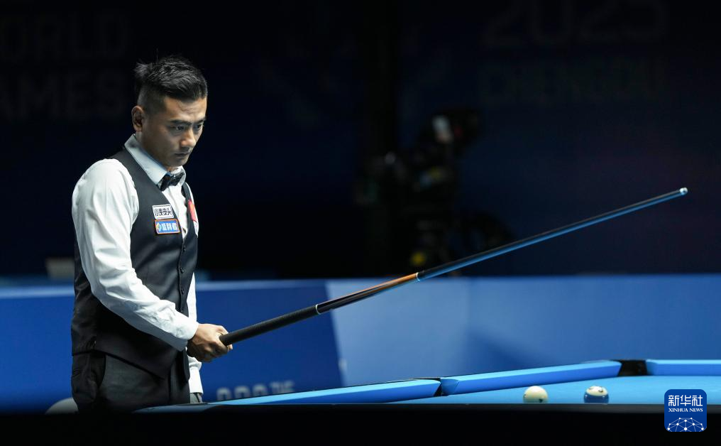 当日,在2025年成都世运会男子花式台球预赛C组比赛中,中国选手薛珍麒战胜另一位中国选手党金虎。