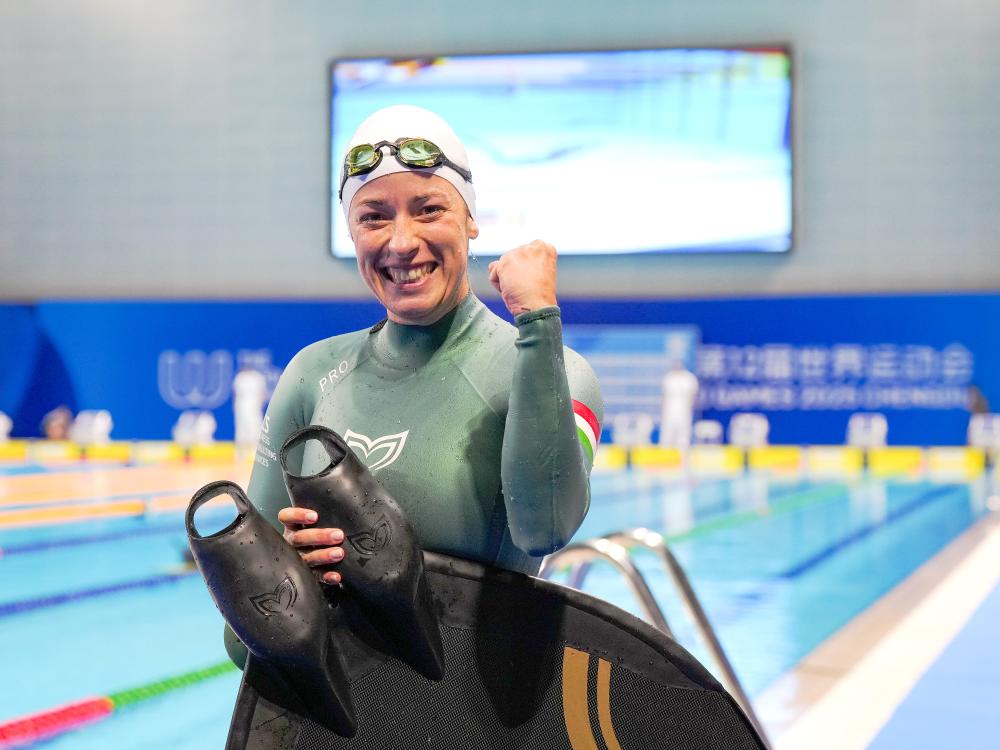 匈牙利选手索菲娅·特勒奇克,将她的答案写进了自由潜女子动态有蹼项目世界纪录——300米。11日,她用一口气,在成都世运会自由潜项目的50米标准泳池中往返了整整3个来回,在原世界纪录的基础上向前整整推进了16米。