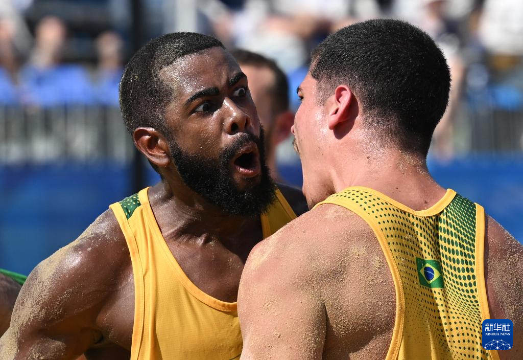 8月12日,巴西队球员奥利韦拉(左)与队友莫赖斯在防守成功后庆祝。