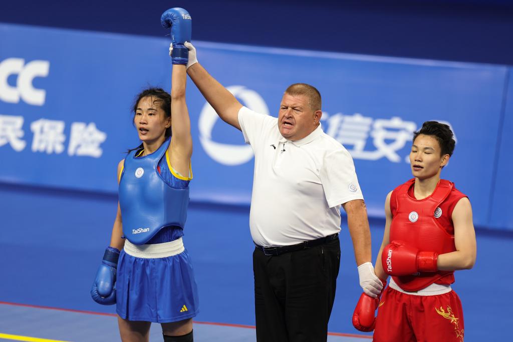 8月12日,裁判宣布中国选手李志勤(左)在武术女子散打60公斤级金牌赛获得冠军。新华社记者 陈斌 摄