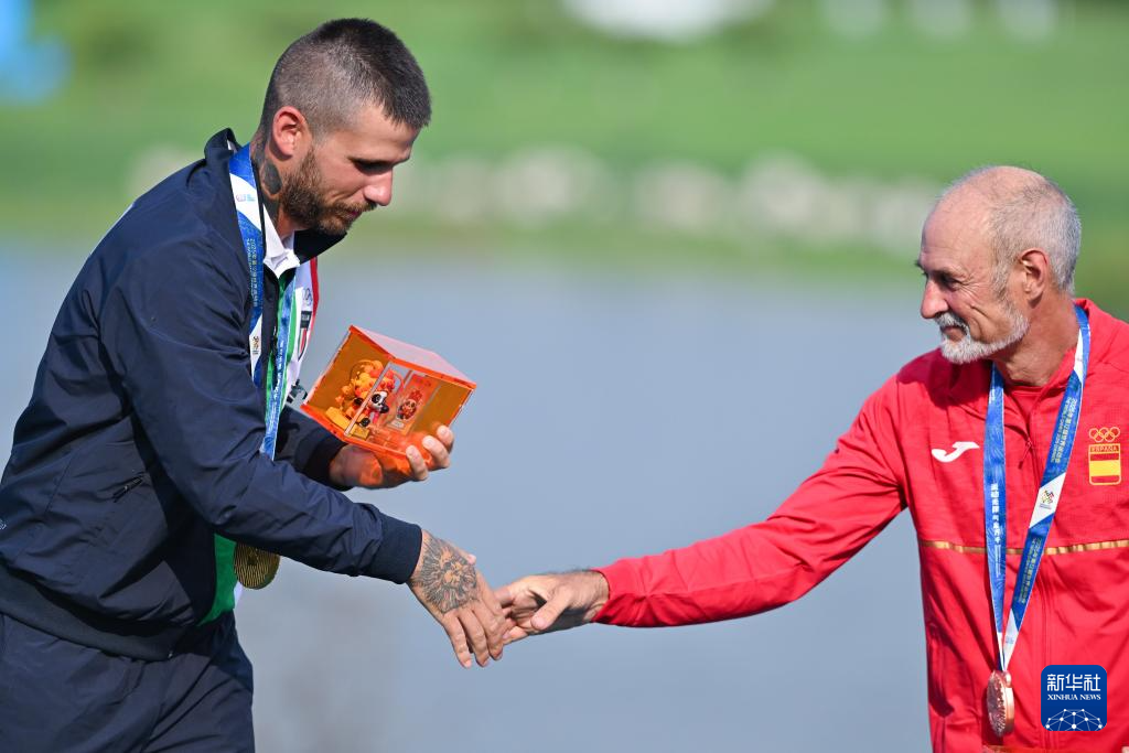 8月16日,冠军意大利选手巴尔别里(左)与季军西班牙选手贝拉在颁奖仪式上握手。