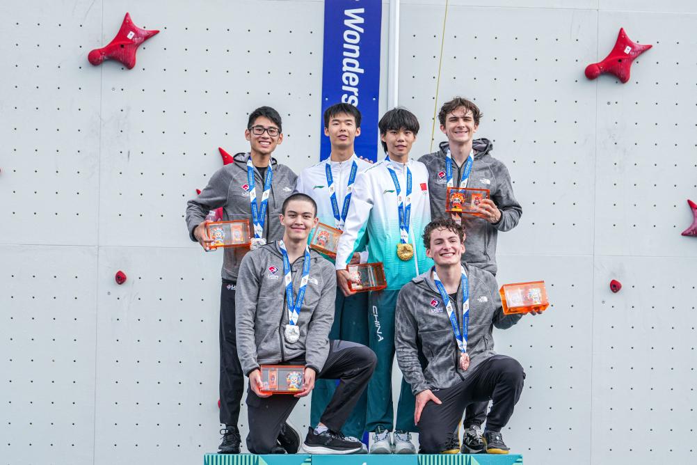 8月16日,获奖选手在颁奖仪式现场合影。当日,在2025年成都世运会攀岩男子速度接力赛决赛中,中国组合龙见国/储守宏获得冠军,美国组合霍姆/施勒希特获得亚军,另一对美国组合哈默/沃特森在铜牌赛中击败印度尼西亚组合莱昂纳多/穆罕默德获得季军。新华社记者 丁增尼达 摄