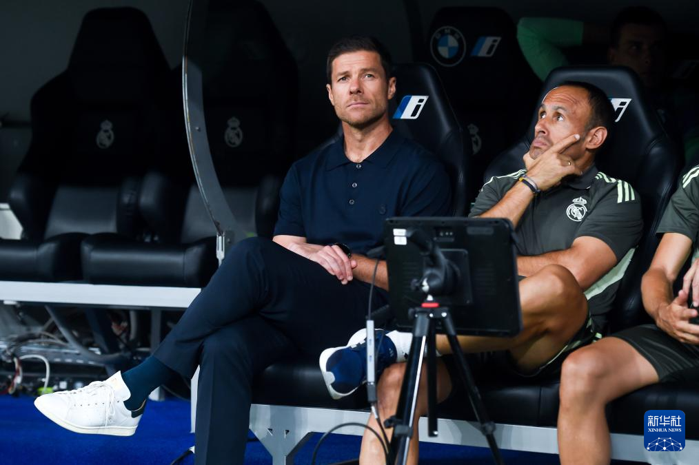 8月19日,皇家马德里队主教练阿隆索(左)在场边观赛。