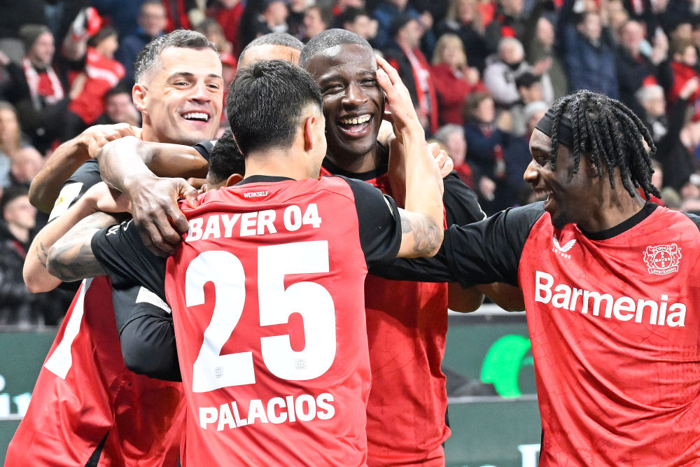 3月28日,勒沃库森队球员在2024-2025赛季德国足球甲级联赛第27轮比赛赛后庆祝获胜。新华社发(乌尔里希·胡夫纳格尔摄)