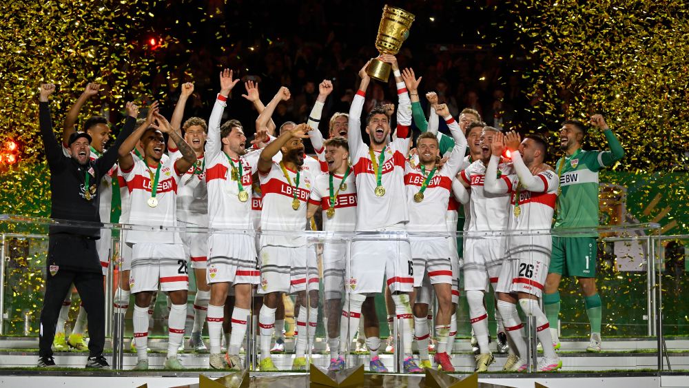 5月24日,斯图加特队成员在2024-2025赛季德国杯颁奖仪式上庆祝夺冠。新华社发(乌尔里希·胡夫纳格尔 摄)