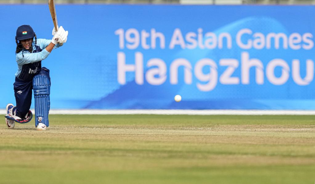 2023年9月25日,印度队球员杰米玛·杰茜卡在比赛中。当日,在杭州亚运会板球项目女子决赛中,印度队战胜斯里兰卡队,夺得冠军。新华社记者 吴壮 摄