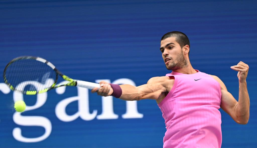 9月5日,阿尔卡拉斯在比赛中回球。新华社记者 李睿 摄