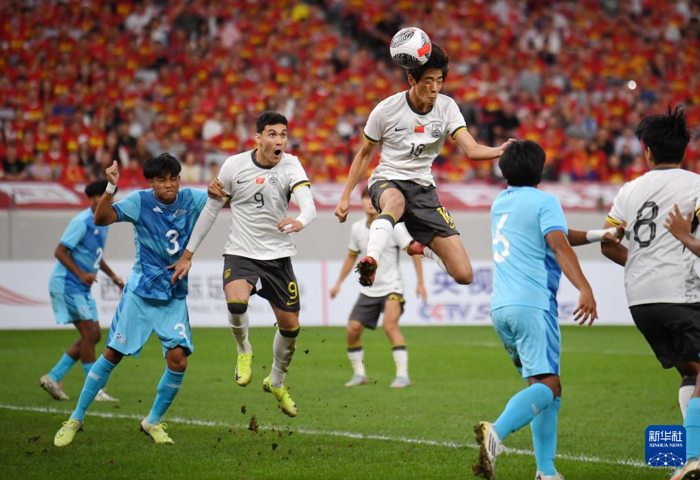 9月6日,中国队球员朱鹏宇(中)在比赛中头球攻门。