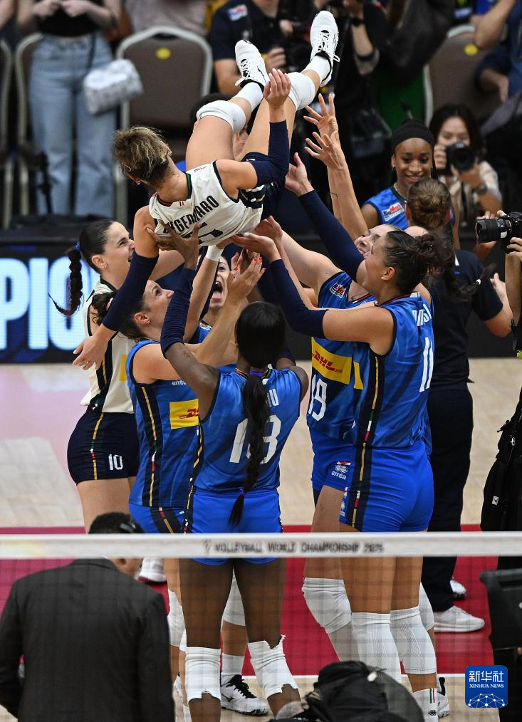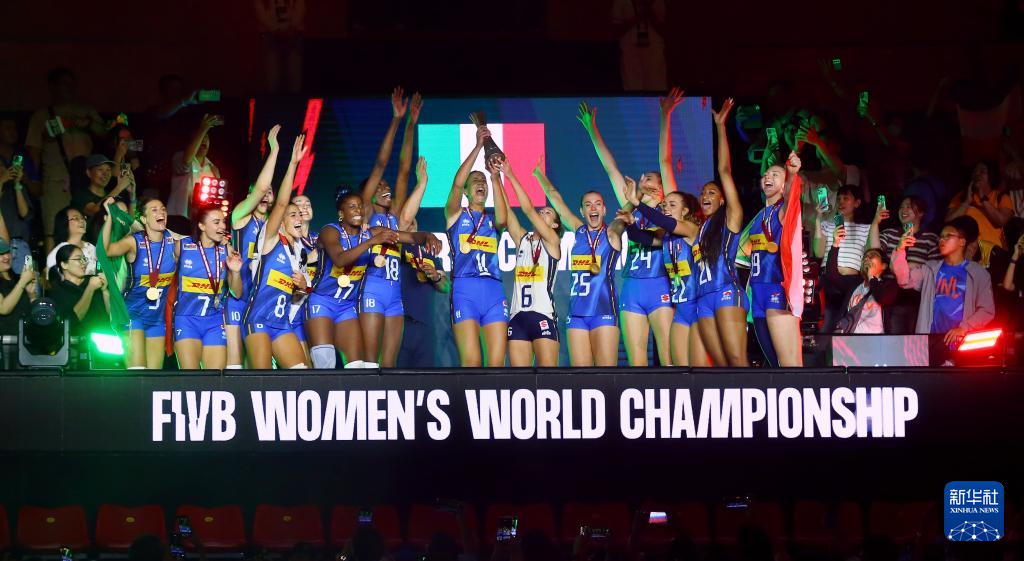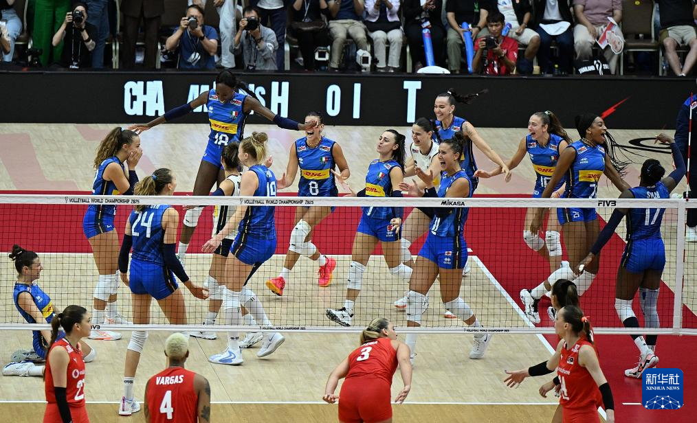 当日,在泰国曼谷进行的2025年世界女排锦标赛决赛中,意大利队3比2战胜土耳其队,获得冠军。