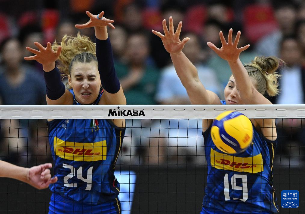 9月7日,意大利队球员叶卡捷琳娜·安特罗波娃(左)、萨拉·路易莎·法尔在比赛中拦网。