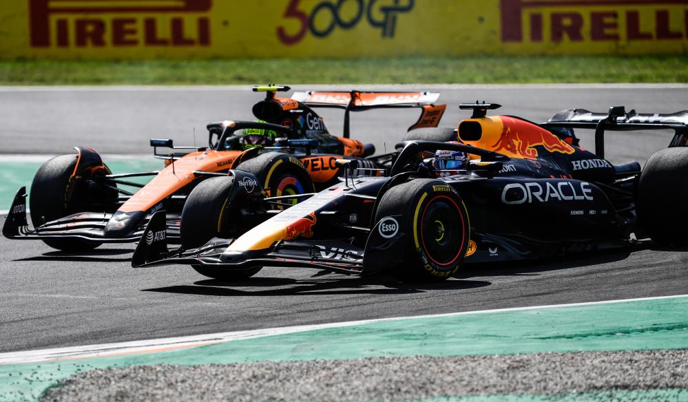 第四圈,维斯塔潘借助发车直道的尾流与DRS(减阻系统),在一号弯外线超越诺里斯,夺回领跑位置并迅速建立起领先优势。