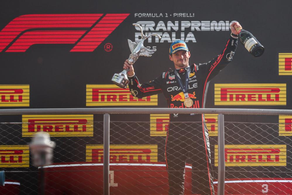 9月7日,红牛车队荷兰车手维斯塔潘捧起本站冠军奖杯。新华社发(钱俊摄)