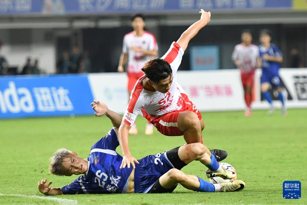 9月7日,娄底队球员孙绮(左)与长沙队球员肖劲光在揭幕战中拼抢。