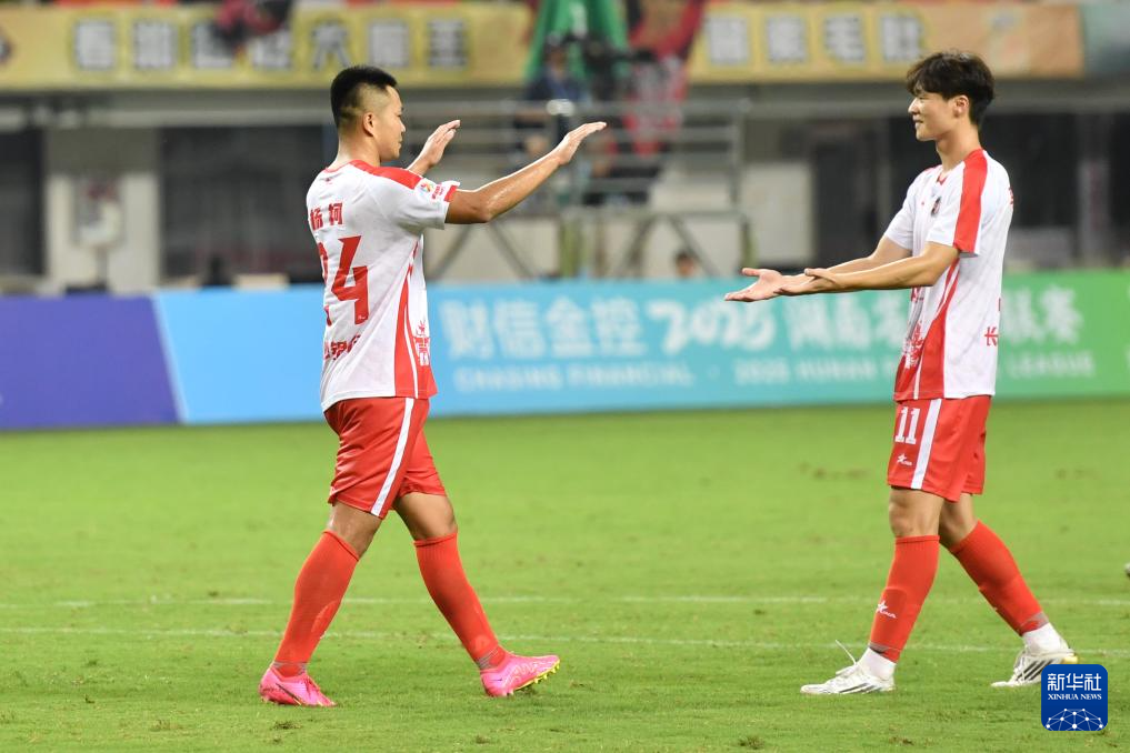 9月7日,长沙队球员杨柯(左)在揭幕战中进球后与队友李章毓庆祝。