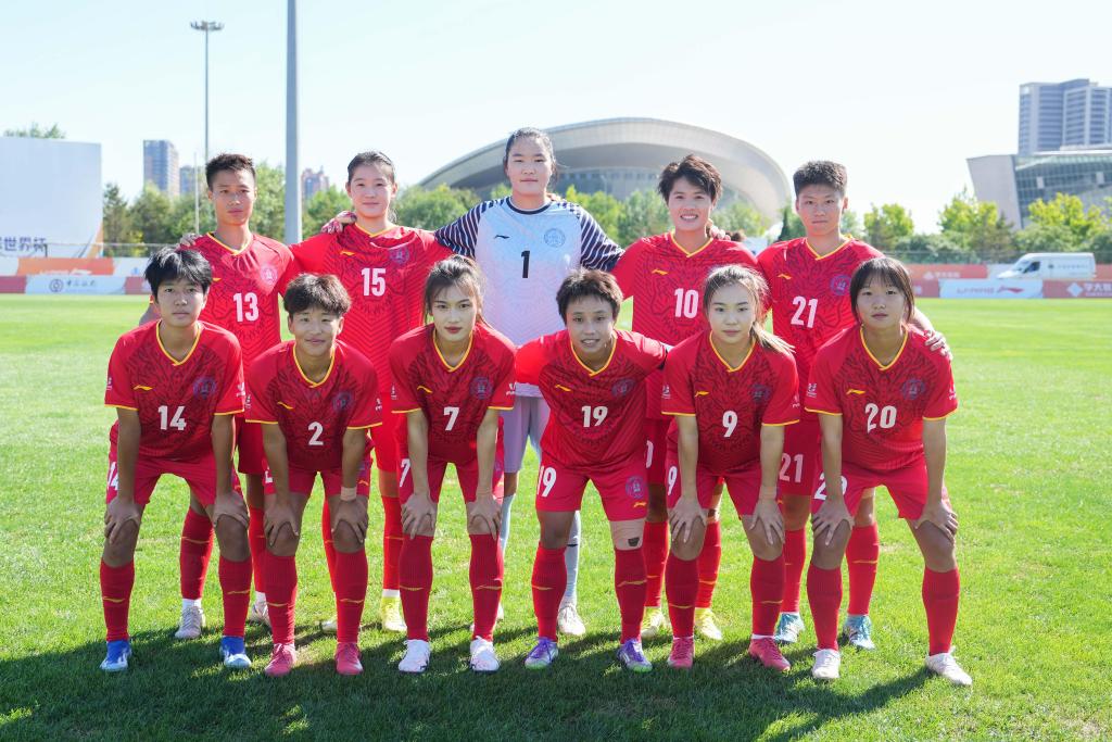 9月18日,北京师范大学女足球员在赛前合影。新华社记者 郑焕松 摄